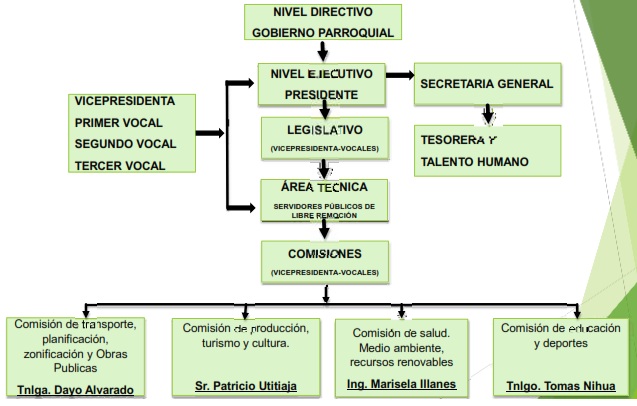 La estructura institucional se realiza básicamente en función de los trabajos a ejecutar, y del nivel de especialización o preparación requerida. Para ello, es importante considerar la visión de desarrollo y la misión del GAD para lograrlo, con un presupuesto que incluye un intenso trabajo de coordinación con los distintos niveles de gobierno involucrados. Sin embargo, en la vida diaria, y en general, el gobierno parroquial funciona acorde de los recursos y presupuestos disponibles en la institución.